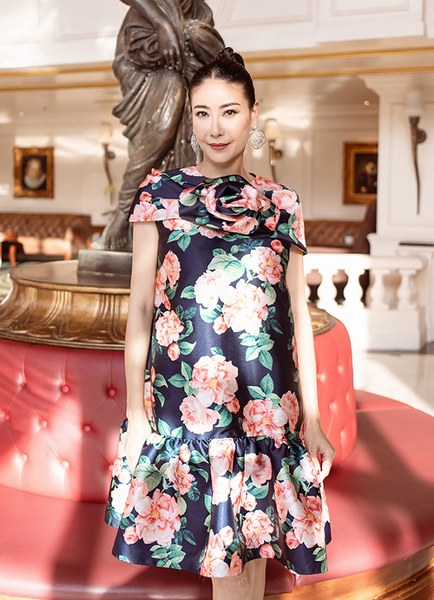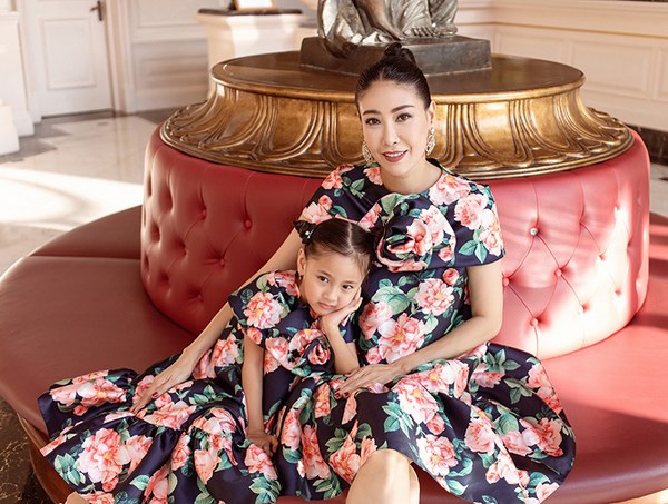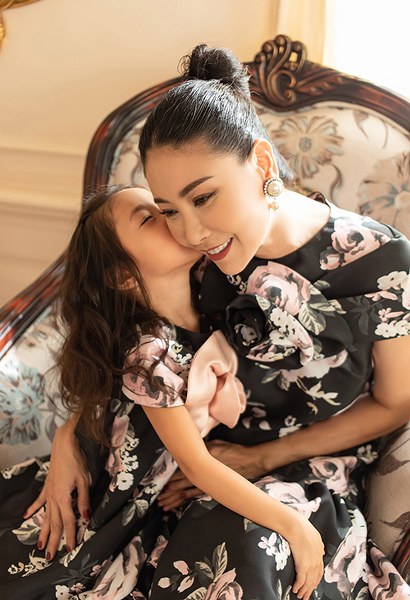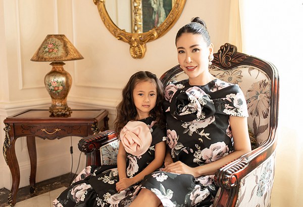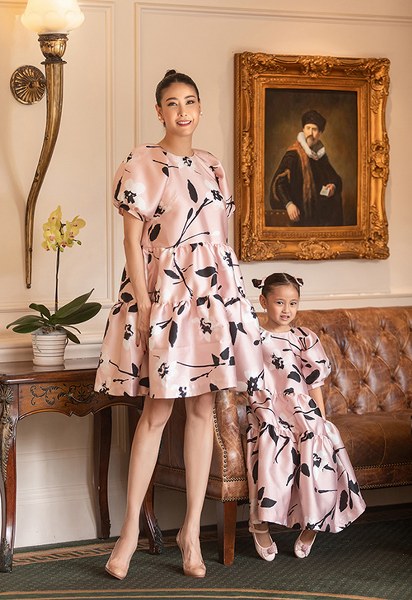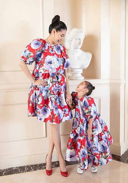 Những thiết kế phom rộng, họa tiết hoa lá màu sắc mang đến vẻ ngoài tươi trẻ cho Hoa hậu Việt Nam 1992 và nét đáng yêu cho bé Viann.