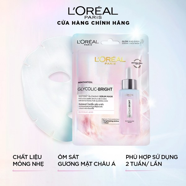 Mặt nạ chứa nồng độ hoạt chất làm sáng da cao nhất từ L’Oréal Paris trong 1 lần sử dụng, giúp nuôi dưỡng và làm sáng da chuyên sâu. Bên cạnh đó, thành phần chính từ Glycolic Acid có trọng lượng phân tử nhỏ nhất trong nhóm AHA, giúp thâm nhập sâu và tẩy tế bào chết nhẹ nhàng trên bề mặt da nhằm đẩy nhanh quá trình tái tạo da. Ngoài ra, sản phẩm được kiểm nghiệm trên hàng trăm phụ nữ Châu Á cho cảm nhận da được nuôi dưỡng sâu, sáng lên rõ rệt sau 15 phút và các vết thâm nám và sạm da mờ dần, da đều màu hơn qua từng ngày.