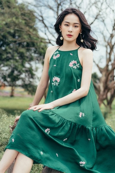 Hạ Vi dạo chơi trong vườn nhãn ở Gia Lâm, Hà Nội trong chiếc váy phong cách vintage