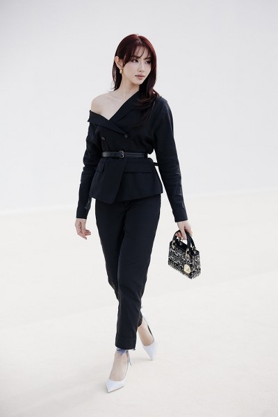Nguyễn Thúc Thùy Tiên đến thưởng thức show Thu Đông 2025 của Dior. Cô diện bộ suit 185 triệu đồng, nhấn bằng áo bất đối xứng, phối giày cao gót 28 triệu đồng. Miss Grand International 2021 xách túi Lady Dior phiên bản giới hạn, đeo charm hình nón lá mang dòng chữ "I love Vietnam".