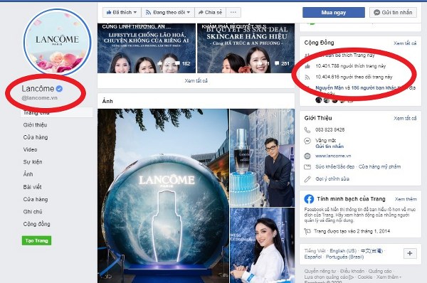 Fanpage Lancôme Việt Nam chính thống: với dấu tick xanh ngay dưới ảnh đại diện và số lượng người theo dõi trang là hơn 10 triệu người
