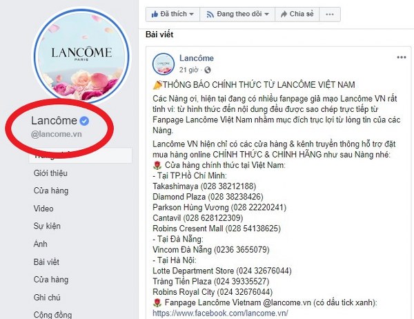 Website của nhãn hàng chính hãng thường sẽ có những tên miền như .vn, .com, hay .com.vn… là những tên miền cấp cao, đòi hỏi thương hiệu sở hữu phải đăng ký với cơ quan chức năng, và được Google ưu tiên khi xếp hạng trên công cụ tìm kiếm này. Trên Fanpage chính hãng của Lancôme Việt Nam, ngay dưới tên Fanpage là tên website lancome.vn, với tên miền .vn được nhà nước Việt Nam bảo hộ.