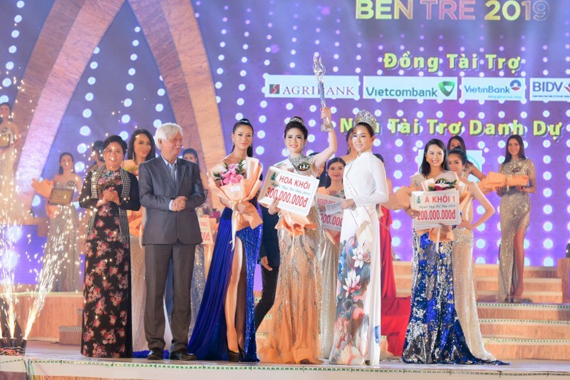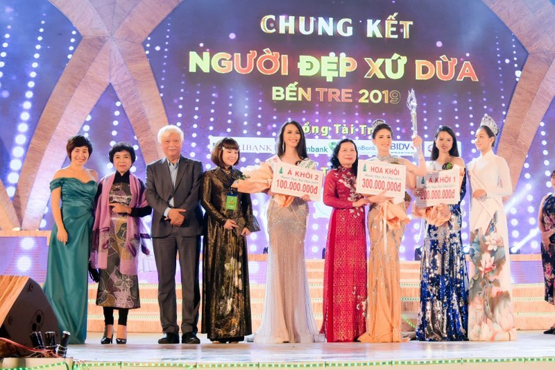 Ông Chu Trọng Dũng – Trưởng BTC và bà Phạm Thị Thanh thảo Chủ tịch HLHPNVN tỉnh Bến Tre cùng Hoa hậu Phan Thị Mơ trao giải Á khôi 1 "Người đẹp Xứ Dừa" 2019 cho SBD 132 Trần Nguyễn Phương Thanh – Thí sinh đồng thời đoạt giải Người đẹp Truyền thông