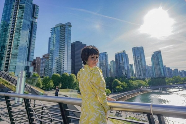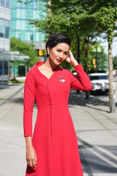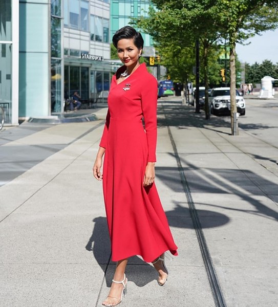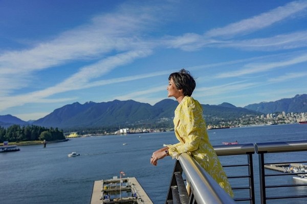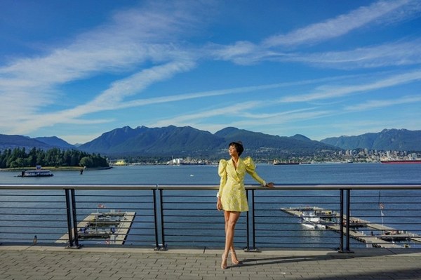 Nhân chuyến công tác Canada, Hoa hậu Hoàn vũ Việt Nam 2017 - H\'Hen Niê diện một thiết kế đầm vàng của Công Trí khoe làn da nâu gợi cảm tự tin tạo dáng trước ống kính trên bờ biển Vancouver.