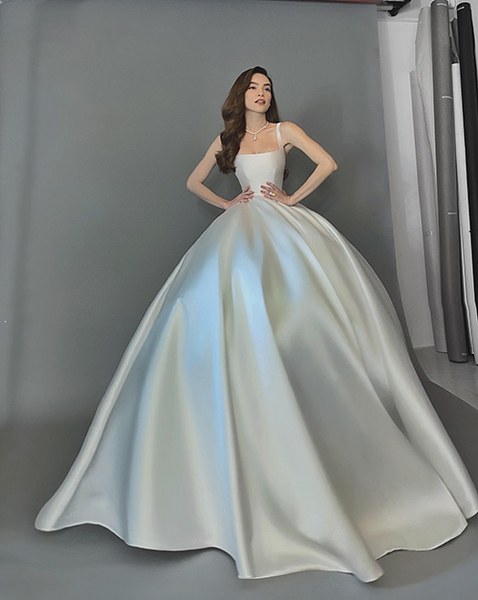 Mẫu đầm bồng cổ điển theo phong cách quý cô Pháp được làm từ lụa Italy. Thiết kế hai dây, cổ vuông giúp khoe triệt để lợi thế vóc dáng của Hà Hồ với ngực đầy và xương quai xanh thanh mảnh. Hiện tại, người hâm mộ rất mong chờ đám cưới của cặp showbiz – một dấu mốc mới cho chuyện tình cảm của đôi uyên ương trong năm 2021.