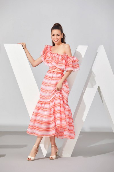 Khi chọn váy áo điệu đà, Hồ Ngọc Hà chải tóc buộc nửa, sandals quai mảnh để hoàn thiện vẻ nữ tính.