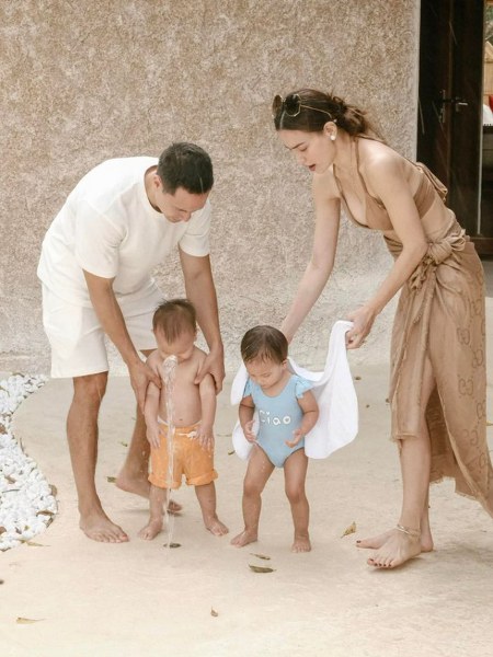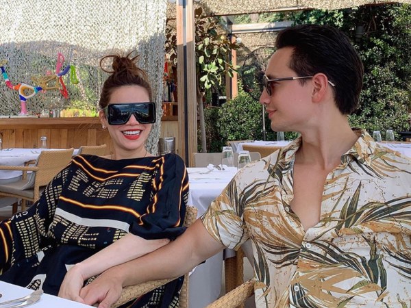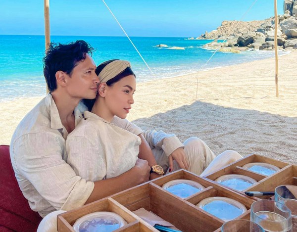 Trang phục màu sắc nổi bật giúp cặp sao có khoảnh khắc khoe dáng trên biển được khen như búp bê Ken và Barbie.