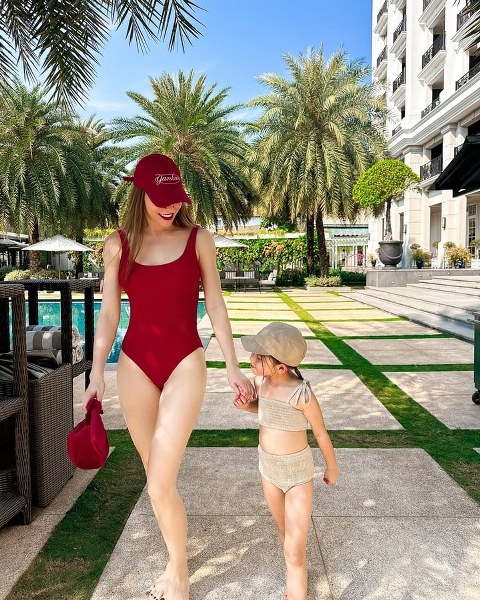 Nữ ca sĩ diện bikini hai mảnh nhỏ xíu, khoe trọn được vóc dáng nóng bỏng mắt. Bên cạnh đó, cô cũng diện cho Lisa một bộ áo tắm đáng yêu.