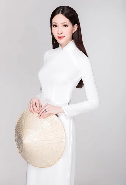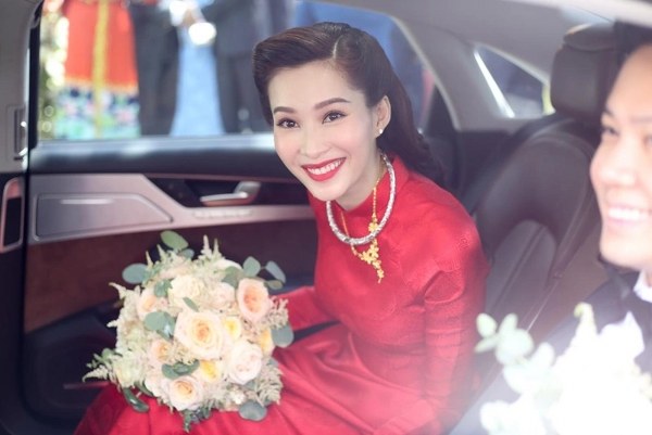 Mỹ nhân diện áo dài do nhà thiết kế Thuận Việt thiết kế, trong đám cưới năm 2017.