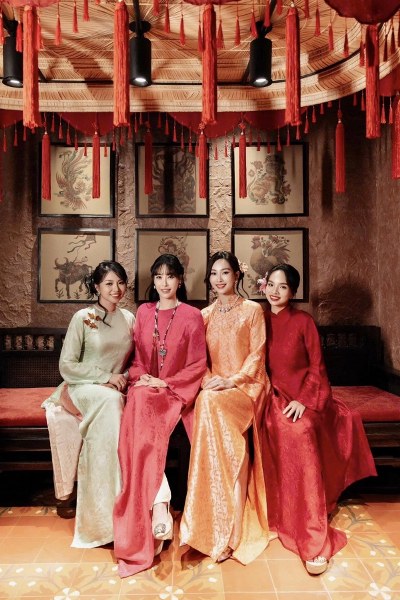Mới đây, Đặng Thu Thảo (thứ hai từ phải sang) dự tiệc cùng hội chị em ở TPHCM, sau thời gian sinh con thứ ba. Cô chọn áo dài suông rộng theo phong cách "cô Ba Sài Gòn xưa". Nhiều khán giả khen phong cách của Đặng Thu Thảo toát lên vẻ đài các, không có nhiều sự thay đổi sau 13 năm nổi tiếng.
