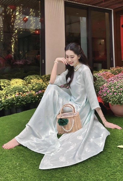 Áo dài lụa, họa tiết đơn giản, chiết eo vừa phải là lựa chọn hàng đầu của Thu Thảo. Mỹ nhân thường phối đồ với các phụ kiện như vòng cổ ngọc trai, túi mây tre đan, cói.