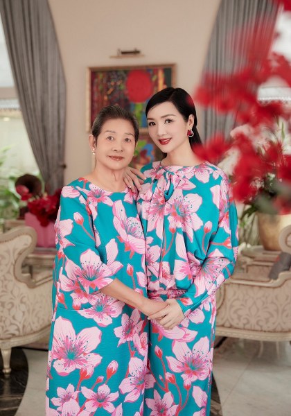 Dịp đầu xuân, Hoa hậu Đền Hùng Giáng My cùng mẹ diện trang phục của Vũ Ngọc và Son. Các thiết kế với họa tiết hoa đào rực rỡ, tạo sự trẻ trung, tươi mới cho người mặc.