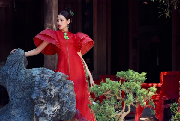 Hoa hậu Đỗ Thị Hà thể hiện mẫu áo dài có tay phồng, loe, tà xếp ly trong bộ sưu tập \"Minh kim tiên hạc\" của Trần Thiện Khánh.