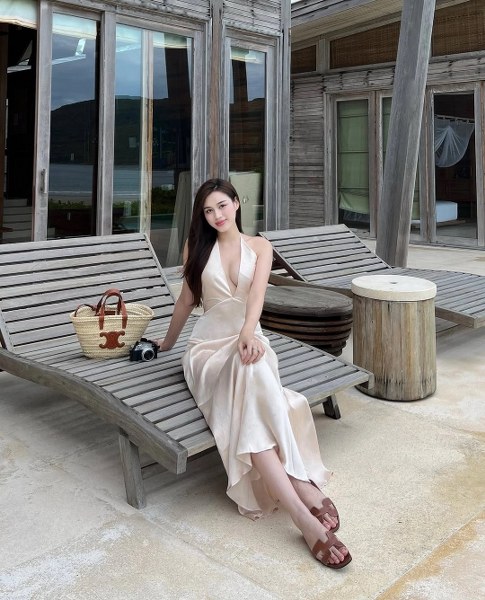 Trong một lần đi nghỉ dưỡng, người đẹp kết hợp maxi lụa xẻ ngực với dép Hermes và túi Celine.