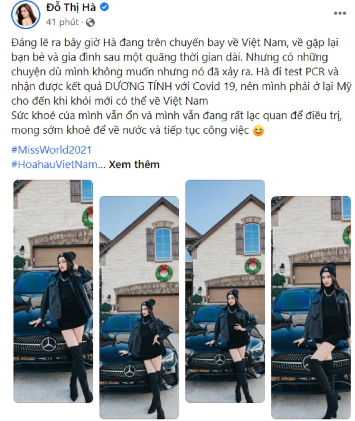 Cách đây ít phút, Hoa hậu Đỗ Thị Hà chia sẻ trên trang cá nhân: "Đáng lẽ ra bây giờ Hà đang trên chuyến bay về Việt Nam, về gặp lại bạn bè và gia đình sau một quãng thời gian dài. Nhưng có những chuyện dù mình không muốn nhưng nó đã xảy ra. Hà đi test PCR và nhận được kết quả dương tính với Covid-19".