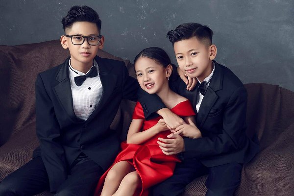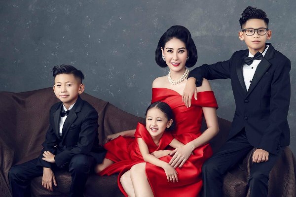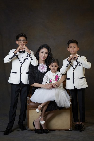 Họ kết hôn ngày 23/7/2007. Sau 13 năm, đôi vợ chồng có ba người con chung: Vương Khang (phải), Vương Khôi (giữa, ngồi) và Vivian. Riêng Nhật Minh (phía sau ghế) là con trai riêng của doanh nhân Trung Nam.