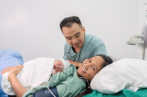 Suốt quá trình bà xã sinh con, chồng cô - nhiếp ảnh gia Tuấn Khôi luôn túc trực bên cạnh, nắm chặt tay, động viên tinh thần. Mỗi khi bà xã lên cơn đau dữ dội, anh không giấu nổi sự lo lắng, thậm chí còn rơi nước mắt vì căng thẳng.