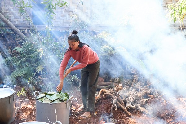 H'Hen Niê cùng ba mẹ, cô dì, chú bác, bạn bè chuẩn bị lá chuối, hàng chục cân nếp, thịt, đậu xanh để gói bánh.