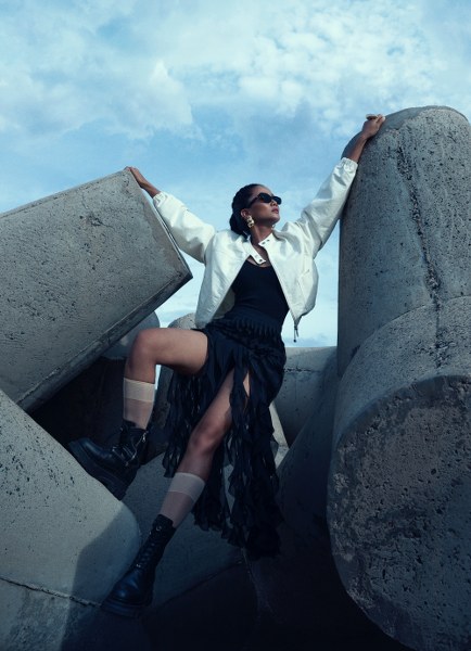Váy xếp bèo tua rua và áo khoác lấy cảm hứng từ quân đội giúp tạo ra sự tương phản gây kích thích thị giác.