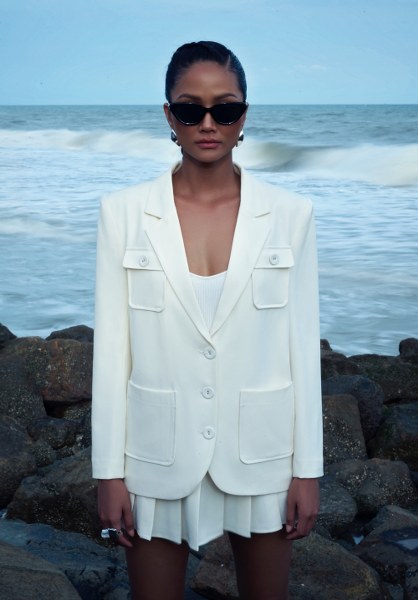 Hoa hậu diện váy trắng xếp ly và áo khoác đồng điệu theo phong cách preppy - một trong những xu hướng nổi bật năm nay.