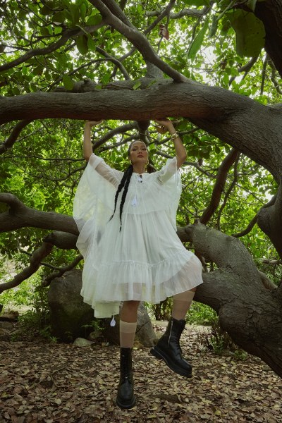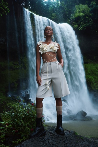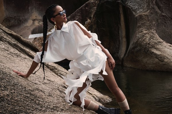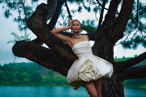 Trong khung cảnh Đà Lạt, cô tạo dáng với đầm trắng được xử lý bằng kỹ thuật tạo phom 3D, gấp nếp bất đối xứng.
