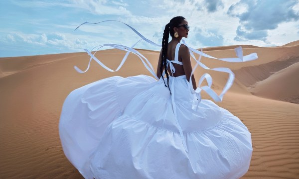 H'Hen Niê tôn da với đầm trắng cut-out dáng maxi trên đồi cát ở Phan Thiết.
