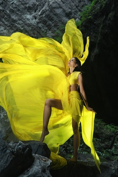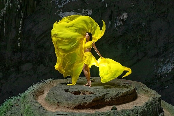 Hoa hậu H\'Hen Niê diện trang phục dạ hội, tung váy tạo nên những thước phim như đang khiêu vũ trong chuyến khám phá hang Sơn Đoòng.