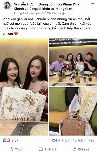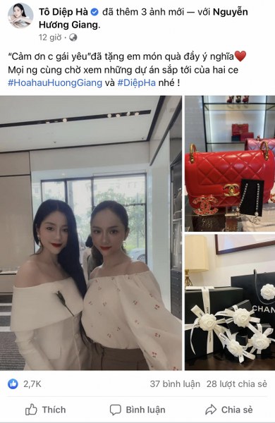 Gần đây, cả hai thường xuyên xuất hiện cùng nhau và đặc biệt khiến dân tình ghen tỵ với mức độ "chịu chơi" khi tặng quà cho nhau với giá trị "khủng. Mới đây, Hoa hậu chuyển giới Hương Giang mới khoe trên trang cá nhân được người bạn thân là doanh nhân Tô Diệp Hà tặng chiếc túi Chanel mới nhất với hoá đơn thanh toán là 320 triệu đồng.