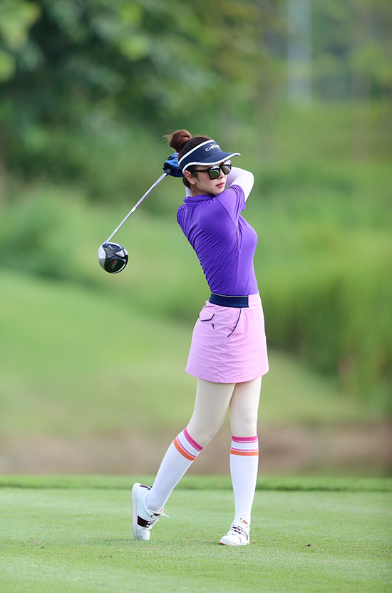 Hoa hậu Jennifer Phạm và diễn viên Hồng Đăng mặc ton-sur-ton rủ nhau đi chơi golf cùng nhóm bạn.