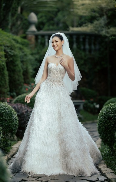 Hoa hậu Khánh Vân diện váy cưới cảm hứng cánh hoa, kiểu dáng cúp ngực, đính nhiều lớp lông vũ trong ảnh cưới.