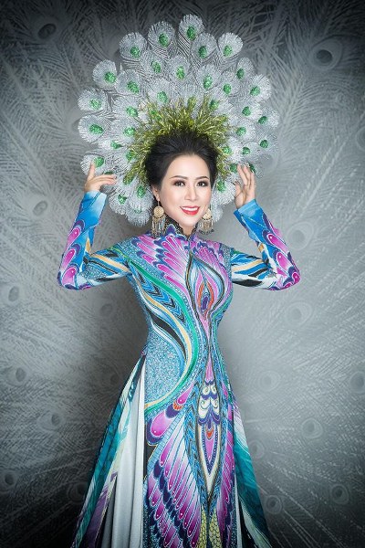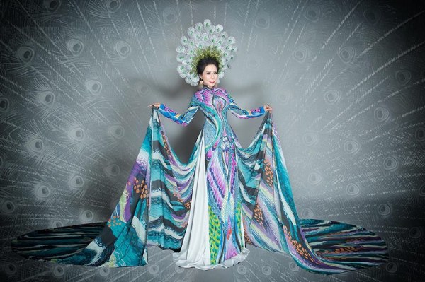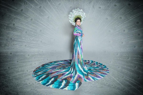 Hoa hậu Phu nhân toàn cầu 2015 khoe vẻ đẹp dịu dàng, duyên dáng khi diện áo dài được thiết kế theo ý tưởng vũ điệu chim công.