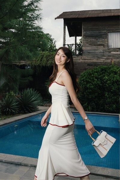 Người đẹp tôn đường cong với đầm đơn sắc hai dây, phối túi cói Loewe. Trang phục phù hợp với kỳ nghỉ, dự tiệc ngoài trời.