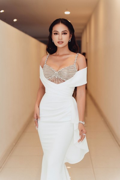 Nhà thiết kế ưu tiên những bộ đầm phom dáng ôm sát cơ thể, khai thác triệt để vẻ gợi cảm và số đo 3 vòng 88-63-96cm của nàng hậu.