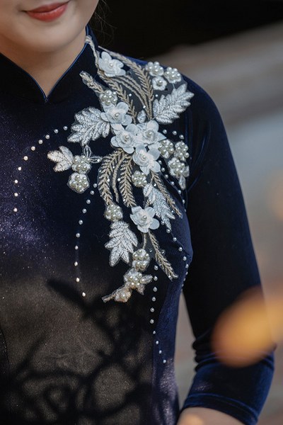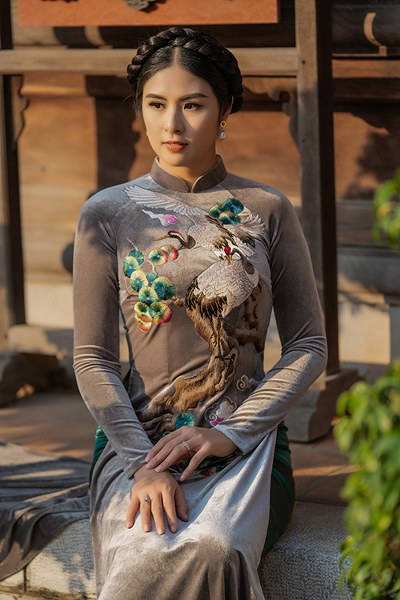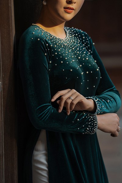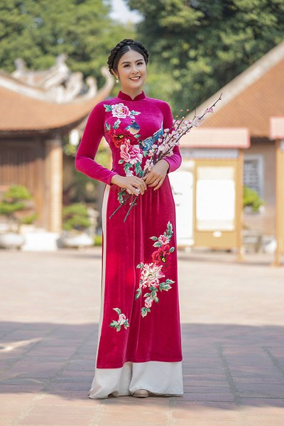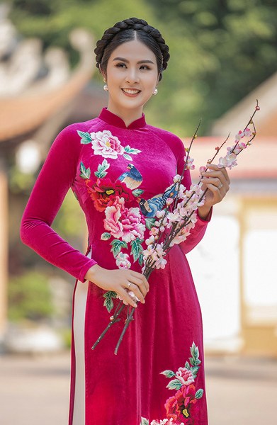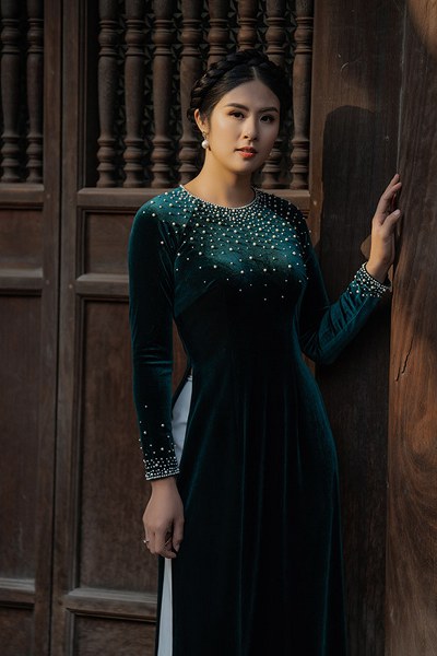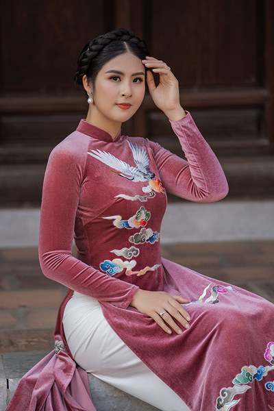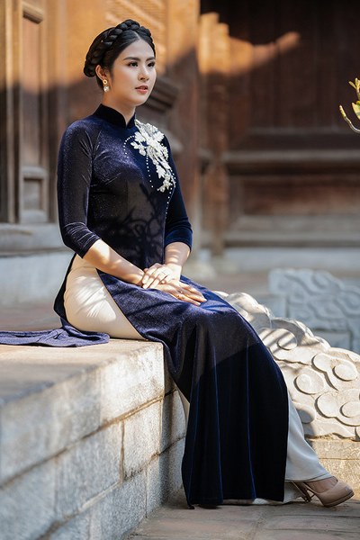 Hoa hậu Ngọc Hân khoe vóc dáng với áo dài nhung do mình tự thiết kế khi dạo bước tại Văn Miếu.