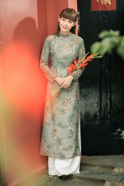 Tà áo dài giúp cô khéo khoe vóc dáng thon thả, trong khi các gam màu trắng, hồng và xanh lá nhạt điểm họa tiết mùa xuân giúp tôn làn da trắng mịn và vẻ đẹp trẻ trung tràn đầy sức sống của người đẹp 8X.