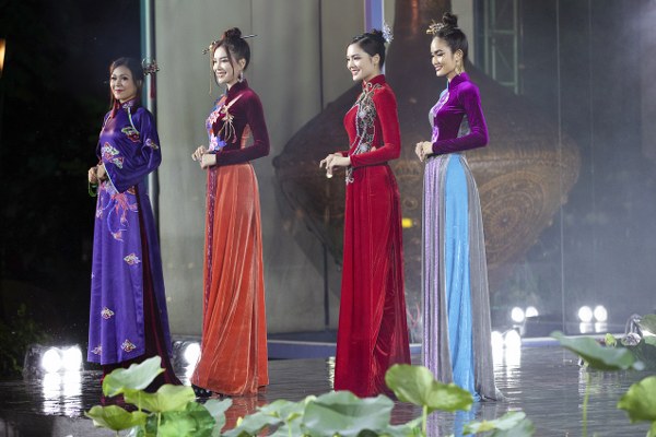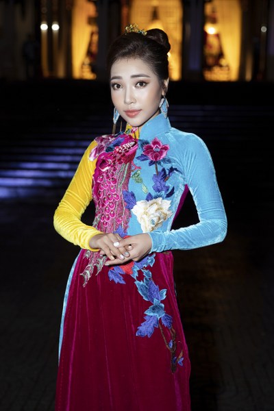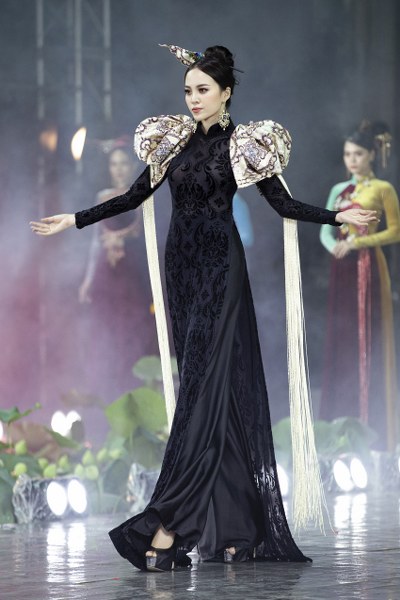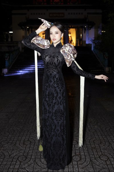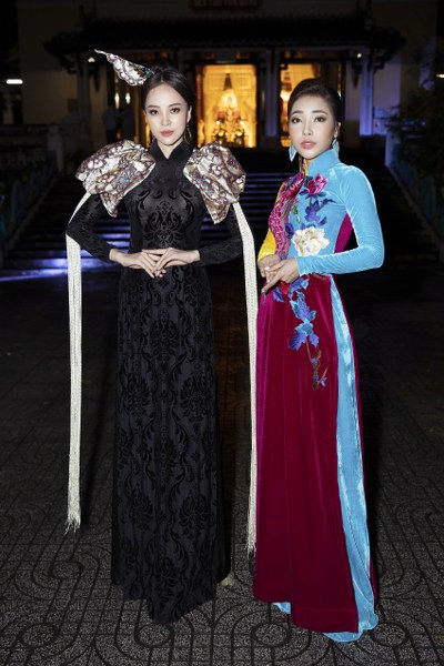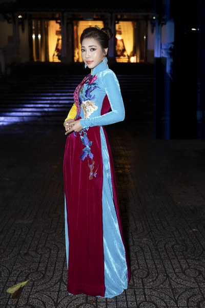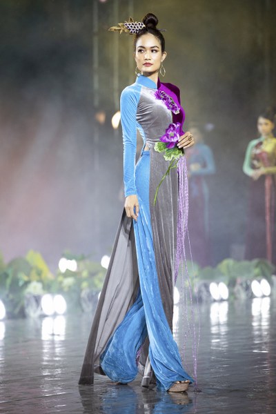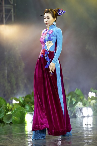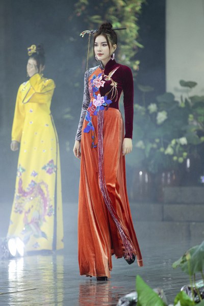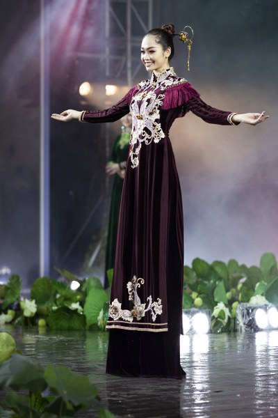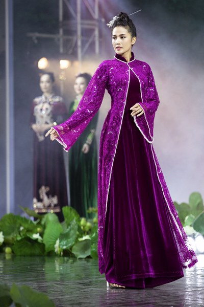 Ngoài ra, NTK Nhật Dũng còn sử dụng chất liệu nhung là một trong những chất liệu khó thực hiện để tạo phom tạo dáng, nhưng với những mẫu áo dài của mình, anh đã tạo cho người mặc phong thái riêng, quý phái và khoe được được cong cơ thể.