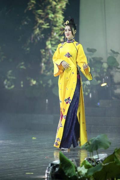 Tại đêm diễn Linh Huỳnh đã nhanh chóng thổi hồn vào bộ trang phục của NTK Nhật Dũng, được biết, BST Vàng son Đất Việt gồm 14 mẫu được thực hiện trên chất liệu lụa Lâm Đồng, được đính kết đá pha lê, công nghệ in 4.0