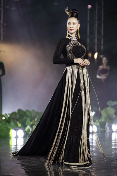 BST "Vàng son đất Việt" này, NTK Nhật Dũng tiếp tục mời Hoa hậu Nhân ái Linh Huỳnh tham gia trình diễn BST của mình.