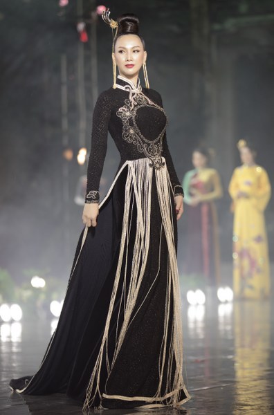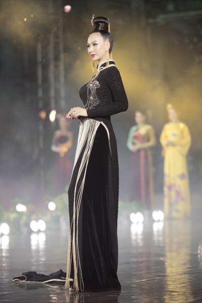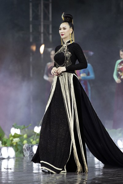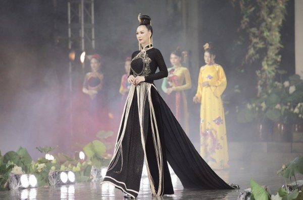 Với BST "Vàng son Đất Việt" gồm 14 mẫu được thực hiện trên chất liệu lụa Lâm Đồng, được đính kết đá pha lê, công nghệ in 4.0