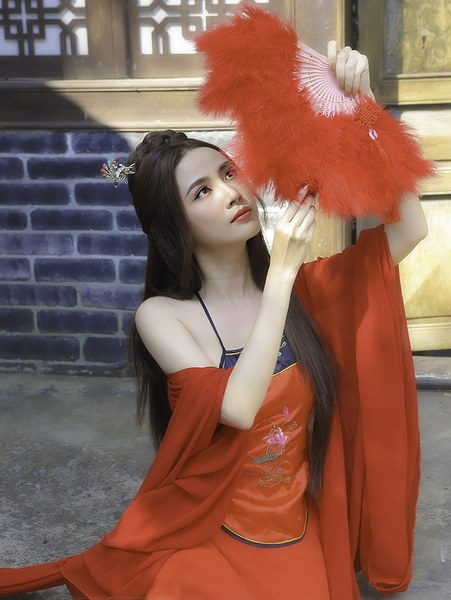 Phan Thị Mơ buông lơi vai áo, để lộ chiếc yếm đào và bờ vai trần gợi cảm