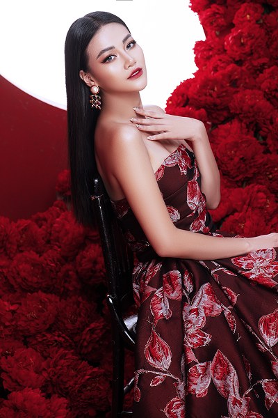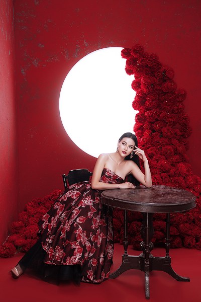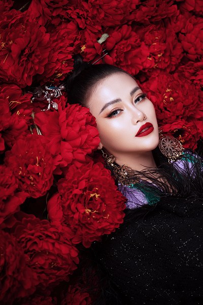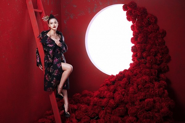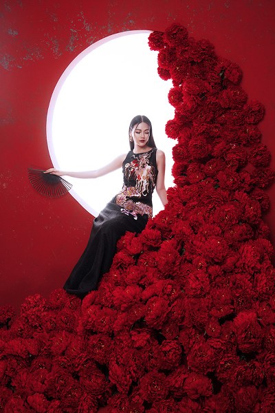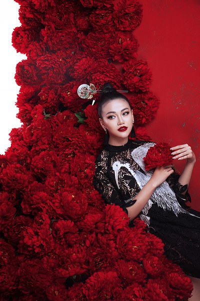 Bối cảnh được dàn dựng công phu với vô số đóa hoa đỏ rực càng tôn lên vẻ đẹp quyền lực, nổi bật của Phương Khánh.
