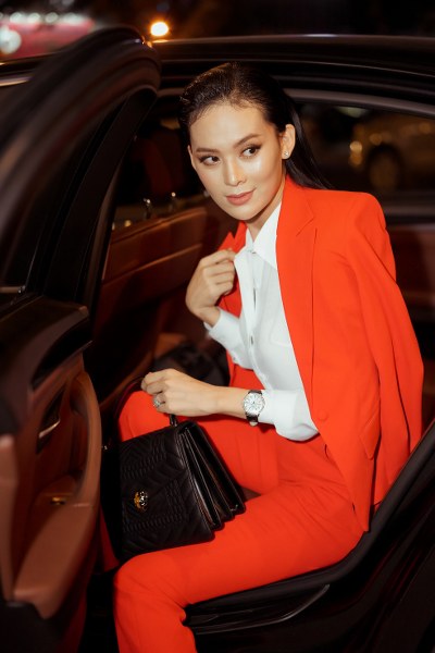 Ngồi trên ghế nóng, Sang Lê thực sự nổi bật với thần thái. Cô diện nguyên câu đồ hiệu với chiếc túi xách của thương hiệu Bvlgari, giầy Louboutin đính đá, điểm nhấn chính là chiếc đồng hồ Thụy Sĩ Piaget. Sang Lê cũng thường đeo chiếc nhẫn kim cương của ông xã tặng.