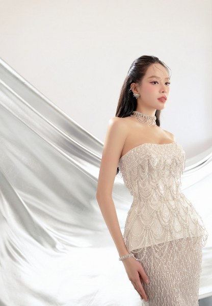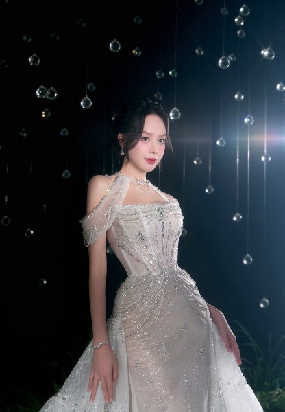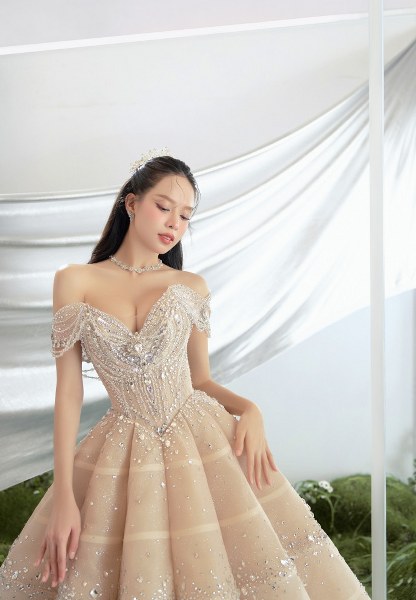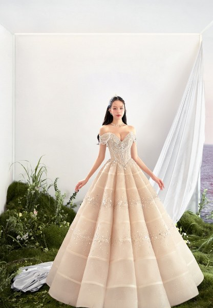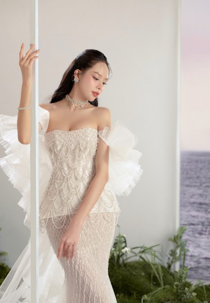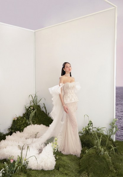 Ngoài ra, nhà mốt có cách xử lý phom dáng khá cầu kỳ, như định hình vòng eo cô dâu bằng thiết kế áo corset lộ ngoài, đính toàn bộ ngực bằng pha lê ánh kim cương để thu hút ánh nhìn vào vòng 1 của cô dâu.