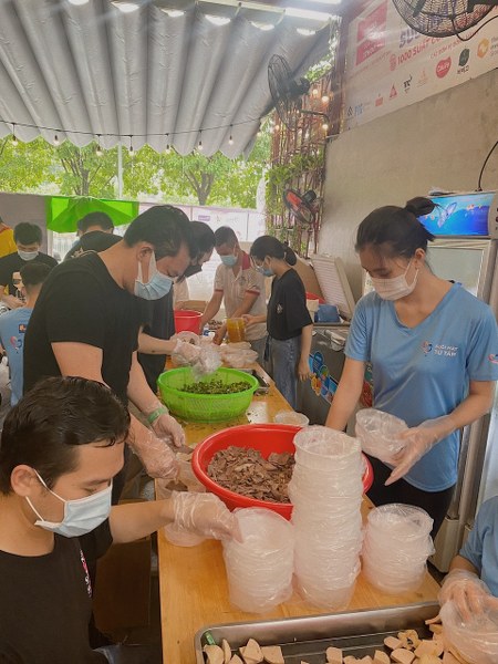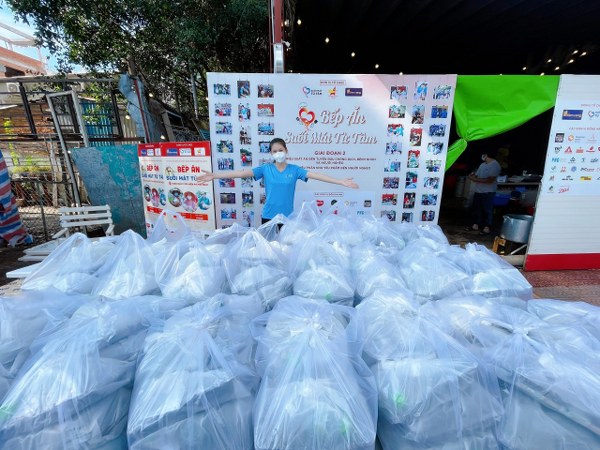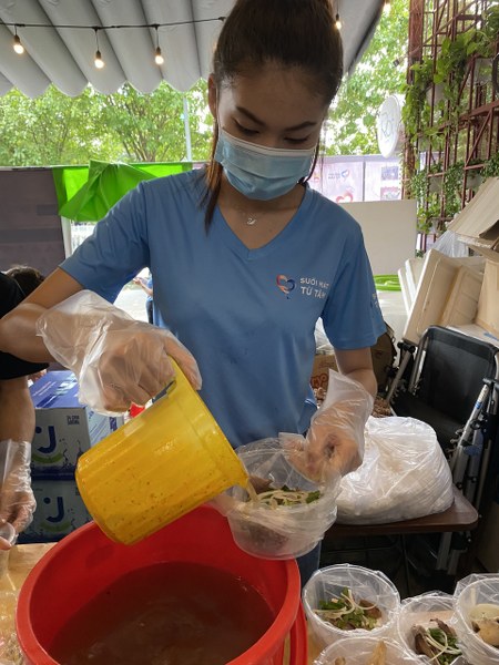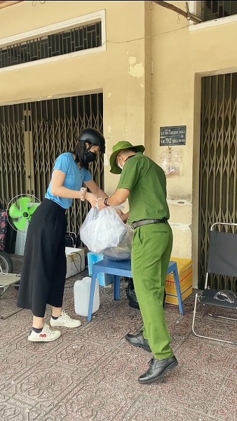 Ăn mặc giản đơn, Hoa hậu Tiểu Vy và Á hậu Ngọc Thảo đi xe máy mang từng phần cơm để trao tận tay cho lực lượng tuyến đầu chống dịch.