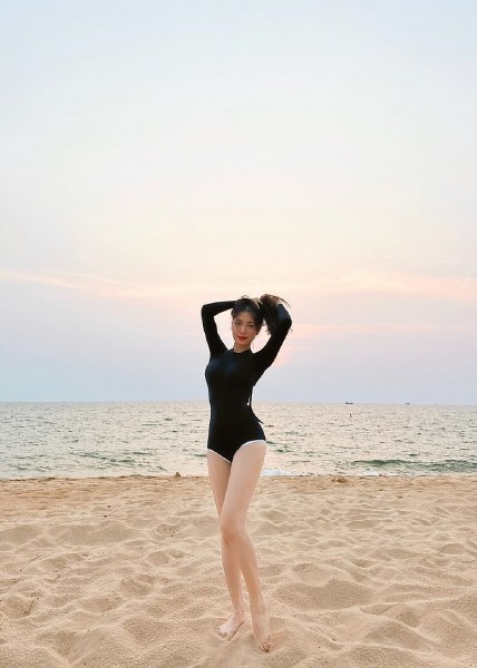 Trong loạt ảnh mới nhất, Hòa Minzy diện áo tắm 1 mảnh màu đen, tự tin tạo dáng trên bãi biển. Bộ đồ tắm kín mít nhưng bó sát giúp nữ ca sĩ phô diễn trọn vẹn những đường cong hút mắt.