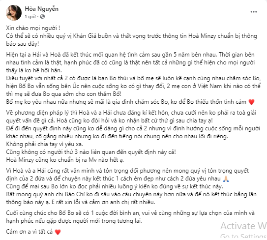 Bố mẹ không yêu nhau nữa nhưng sẽ mãi là gia đình chăm sóc Bo, không để Bo thiếu thốn tình cảm", Hoà Minzy thông báo.