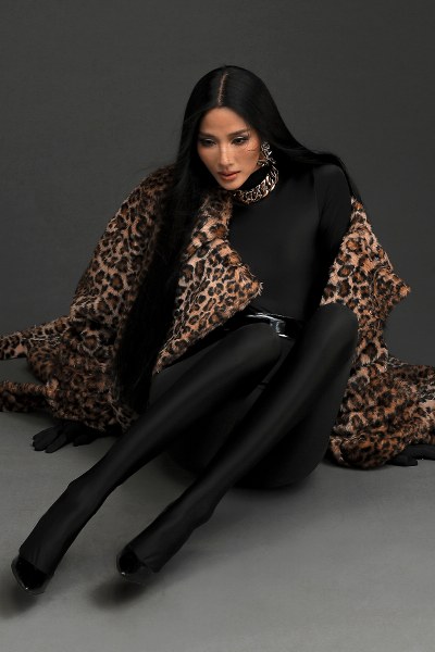 Nhà thiết kế lăng xê phong cách Mob Wife (vợ ông trùm) đang gây sốt trên thế giới qua bộ catsuit màu đen, nhấn bằng áo khoác lông họa tiết da báo quá khổ, làm bật lên tinh thần sang trọng và quyền lực.