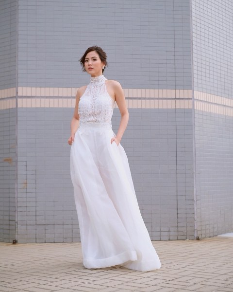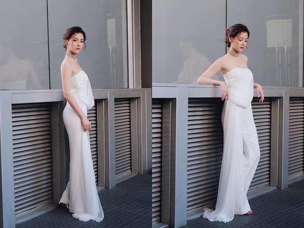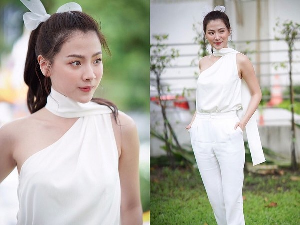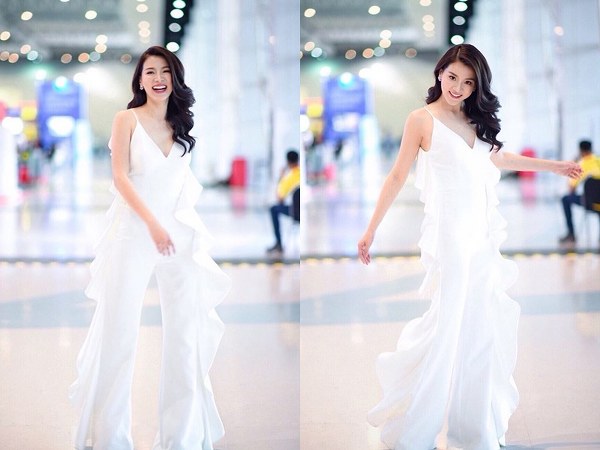 Cách chọn diện jumpsuit ống rộng với kiểu đính bèo nhún càng tôn lên vóc dáng thanh mảnh và thần thái rạng rỡ của cô. Quả thực khiến người nhìn dù phải ngắm Baifern Pimchanok quanh năm trong những bộ đồ trắng cũng không hề chán mắt.