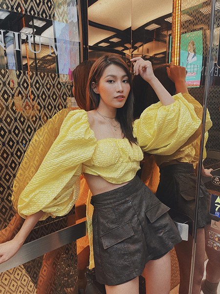 Set đồ của Chế Nguyễn Quỳnh Châu dành cho các bạn gái thích tạo sự nổi bật với áo tay bồng, tông vàng đi cùng chân váy chữ A.