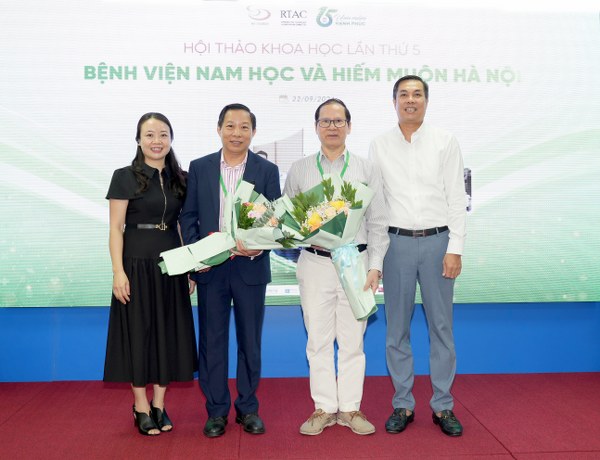 Chủ toạ Hội thảo - GS.TS Nguyễn Đình Tảo cùng Đại diện Bệnh viện - ThS.BS Lê Thị Thu Hiền tặng hoa cho các Báo cáo viên